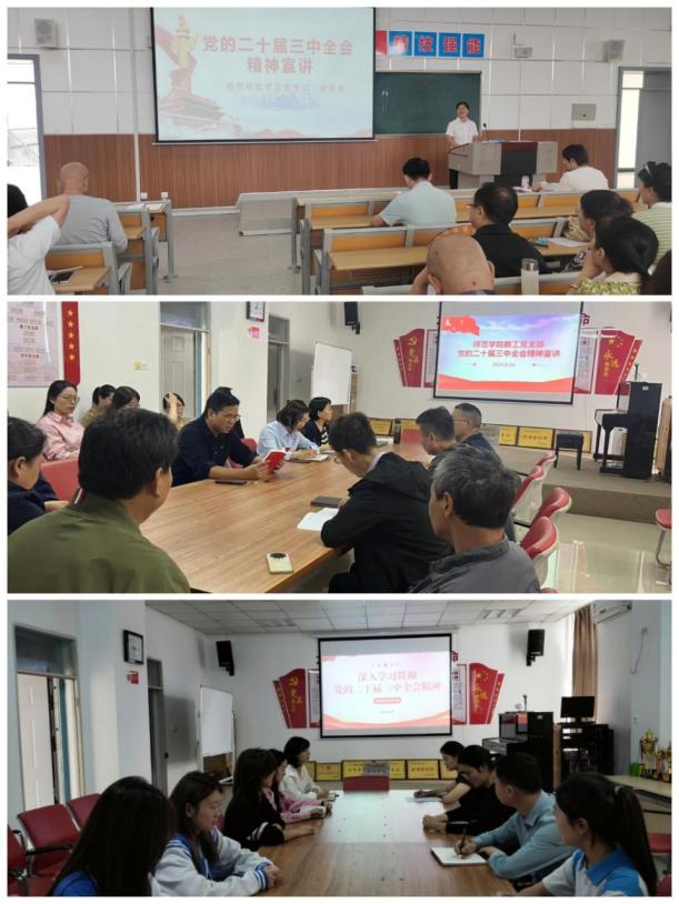 10月9日,教工党支部和学生党支部分别召开会议,学习传达党的二十届三中全会精神。学习好贯彻好党的二十届三中全会精神,是一项重大政治任务。通过学习宣讲,增强了广大党员、干部、师生学习宣传贯彻全会精神的思想自觉和行动自觉,提升党员干部的政治素养和教书育人能力,着力培养高素质高技能人才,为推进教育强国建设,实现学院高质量发展贡献新的、更大的力量。(撰稿:金年会jinnianhuicom 韩宜君 审核:杨瑞侠)