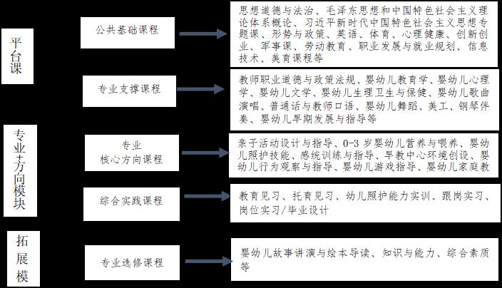 1.0-3 岁婴幼儿家庭教育与指导 2.0-3 岁婴幼儿观察与评价 3.婴幼儿游戏设计与实施 4.婴幼儿早期阅读与指导 5.特殊儿童心理健康指导 |