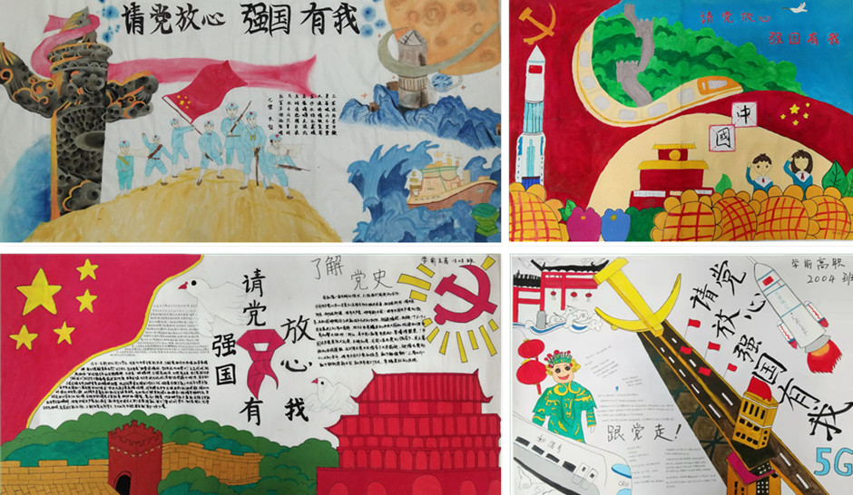 学前高职2006班贺雨晨说“在同学们参与的过程中通过资料搜集和板报制作了解党的历史,培养同学们的爱国情怀,增强学生的民族自信心和自豪感,用作品描绘自己心中的祖国,让学生对自己的强国重任有了更深刻的认识,坚定了我们的理想信念。我们要通过努力学习,去为祖国的美好未来添砖加瓦;我们要坚定信念,以奋斗的青春力量谱写强国时代的新篇章!”(撰稿:金年会jinnianhuicom 郑如意 审核:黄翠萍)