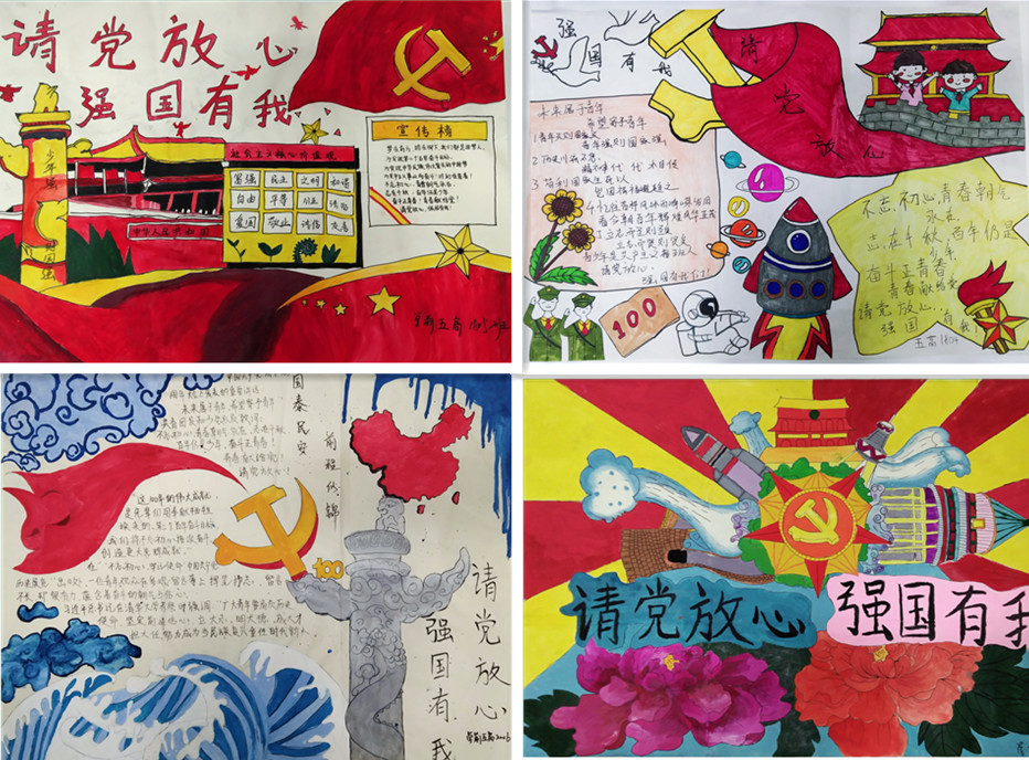 各班学生热情高涨,踊跃参加,紧紧围绕主题详细查阅资料、认真准备,积极参与活动,充分发挥了班集体团队协作的精神。一幅幅图文并茂、色彩鲜明、内容充实、构思新颖的板报作品呈现在大家眼前,用画笔描绘祖国大好河山,用文字书写对祖国美好的祝福,用诗歌抒发“请党放心、强国有我”的誓言,用创意点燃浓浓的爱国之情,诠释了我们新生代力量,要担起强国的大任,不负韶华,不负党和人民的殷切期望!