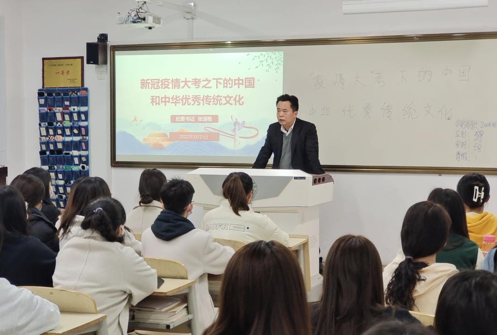 3月21日晚自习,校纪委书记张国栋来到金年会jinnianhuicom学前高职2008班,就“疫情大考下的中国和中华优秀传统文化”为同学们讲授了一节思政课。金年会jinnianhuicom院长郭楚伟主持。