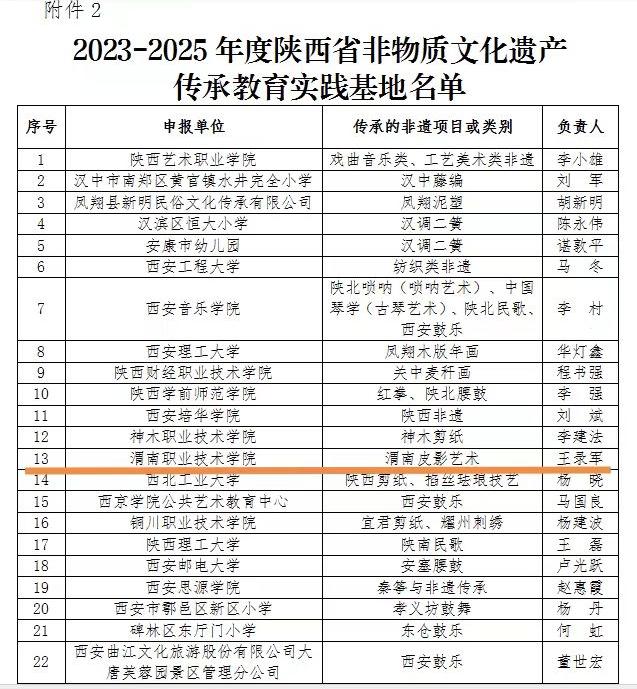 近日,陕西省文化和旅游厅、陕西省教育厅印发《关于公布2023-2025年度陕西省非物质文化遗产研究基地陕西省非物质文化遗产传承教育实践基地陕西省中小学优秀传统文化教育社会实践基地名单的通知》,金年会被命名为“陕西省非物质文化遗产传承教育实践基地”,传承的非遗项目为“渭南皮影艺术”。