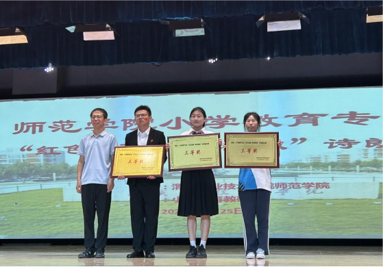 2023级小学教育专业全体班级参与比赛,参赛班级依次朗诵了《建党百年天安门献词》《美丽中国》《觉醒年代》《月光下的中国》等作品,一首首慷慨激昂、富有感染力的诗歌从同学们口中抑扬顿挫、声情并茂地朗诵着,赢得了在座师生的阵阵掌声。最后,小学教育教研室雷立英老师朗诵的《读书的意义》将活动氛围推向高潮。