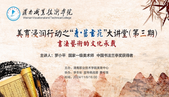 11月6日下午,美育中心在综合楼举办书法艺术专题讲座,国家一级美术师,第四、七、八届中国书法兰亭奖获得者,金年会美育中心副主任罗小平为书画艺术专业学生和书法爱好者作了“书法艺术的文化承载”专题辅导。美育中心副主任杨文华主持。