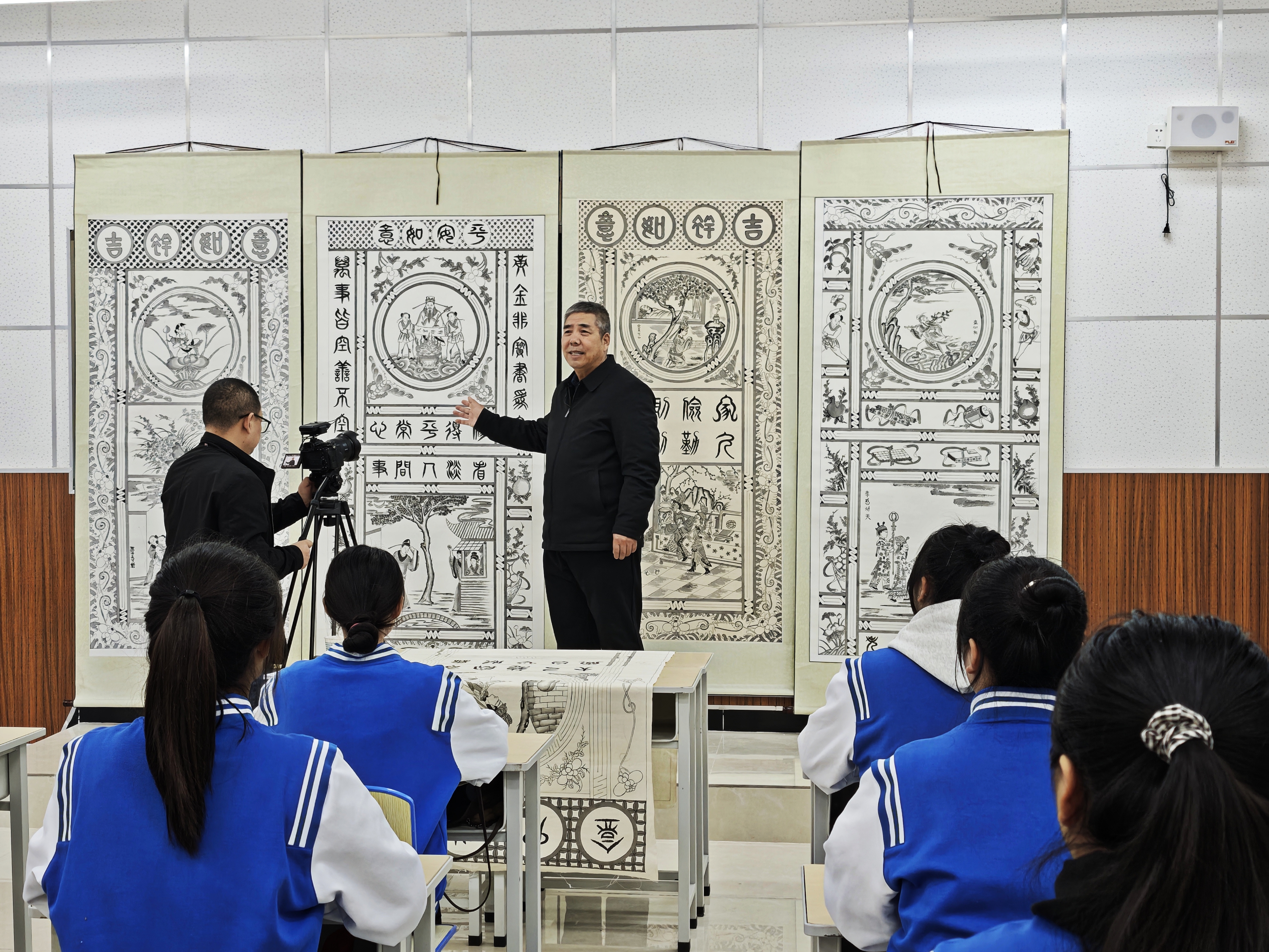 2024年12月3日,渭南广播电视台大型文化精品工程《百集非遗》栏目走进金年会,由金年会客座教授、渭南市皮影协会主席、省非物质文化遗产“澄城手绘门帘”传承人李天社为同学们讲授“澄城手绘门帘”的文化内涵与传承价值。活动由学院美育中心与渭南市民间文艺家协会共同承办。