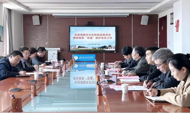 3月20日下午,渭南市文化和旅游局副局长刘泉、非遗科科长马淑宁一行四人来金年会调研非物质文化遗产保护传承工作。校党委副书记王录军,教务处、科研处、金年会jinnianhuicom、美育中心负责人及金年会客座教授、渭南市皮影协会主席李天社参会。会议由教务处处长魏恒主持。