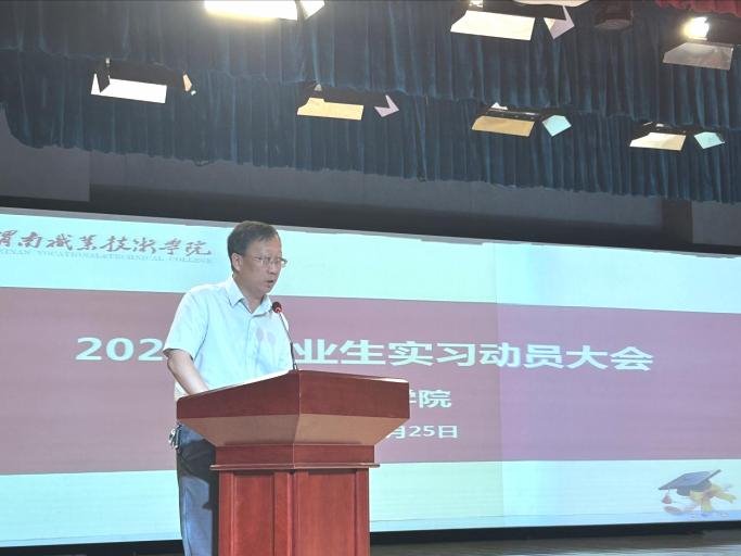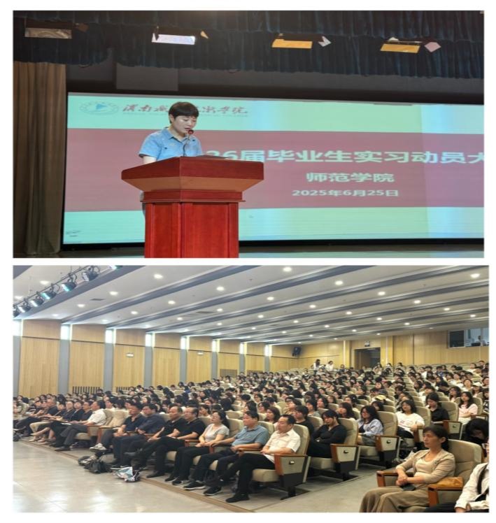 6月25日上午,金年会jinnianhuicom在图书馆报告厅召开了2026届毕业生实习动员大会。党总支书记杨瑞侠,院长郭楚伟,党总支副书记黄翠萍,副院长于晶汝、李永明,团总支书记左馨,实习指导教师代表及1000余名2026届毕业生参会。大会由黄翠萍主持。