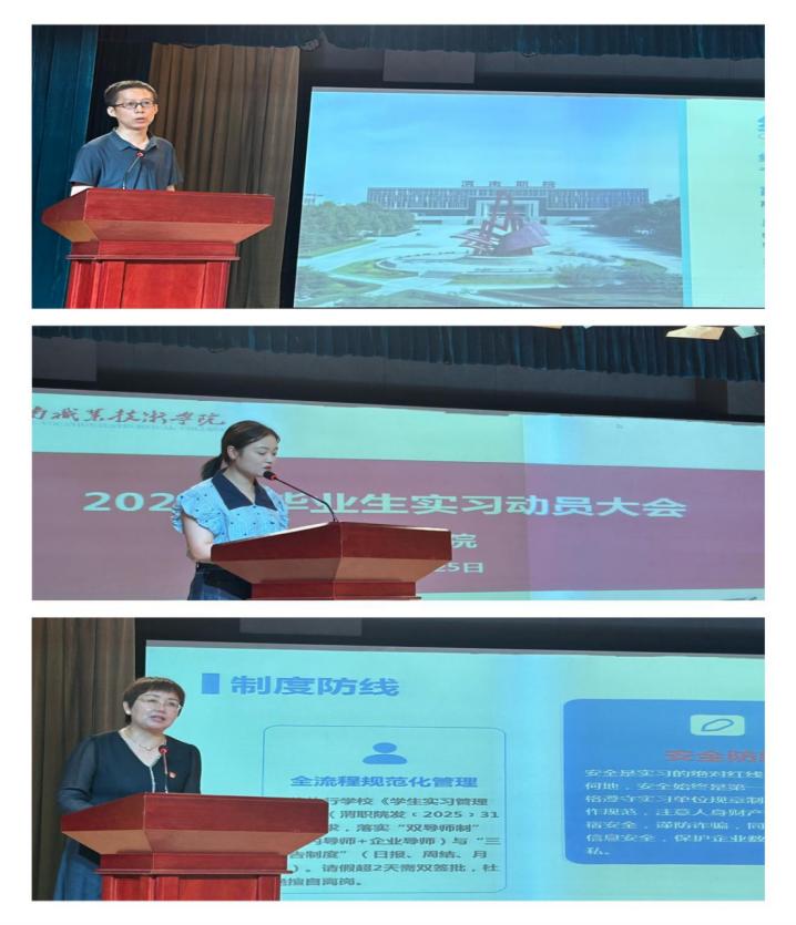 会上,李永明对学校有关实习管理的文件规定作了解读,并对对实习工作作了详尽安排。左馨对实习安全纪律相关事宜作了重点强调。于晶汝围绕聚焦“为何而实习” “如何抓实习” “怎样赢实习” 三个方面,对实习工作提出要求与期望,要求学生要以“空杯心态”拥抱实习,以“底线思维”守护安全与诚信,以“长远眼光”规划实习生涯,并祝愿每一位同学在实习中有所学、有所悟、有所成。