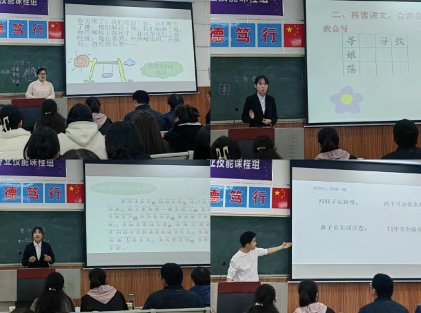小学教育活动设计与实施赛项中,参赛选手基本功扎实,教学设计合理,课件制作美观,教态亲切自然,语言流畅且富有感染力,板书规范,为在场的师生展示了一个个精彩的“无生课堂”,赢得了大家的阵阵掌声。